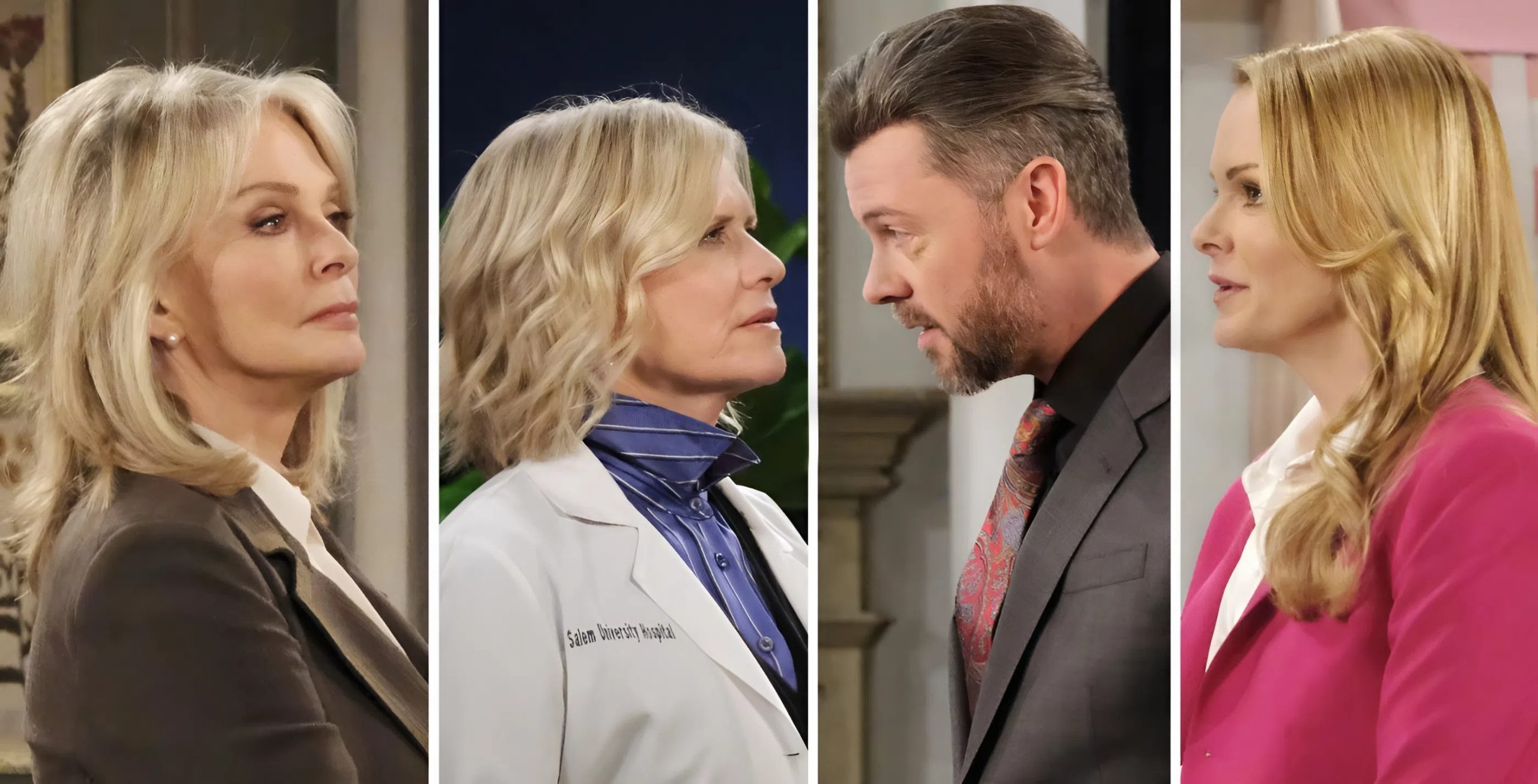Kayla (Mary Beth Evans) has decided that the reason she made a mistake with Marlena’s (Deidre Hall) diagnosis is that EJ’s budget cuts have slowed down University Hospital’s lab. (All the mistakes they’ve made over the past 60 years… well, those were probably EJ’s fault, too. Retroactively.) So Marlena confronts her former son-in-law about it.