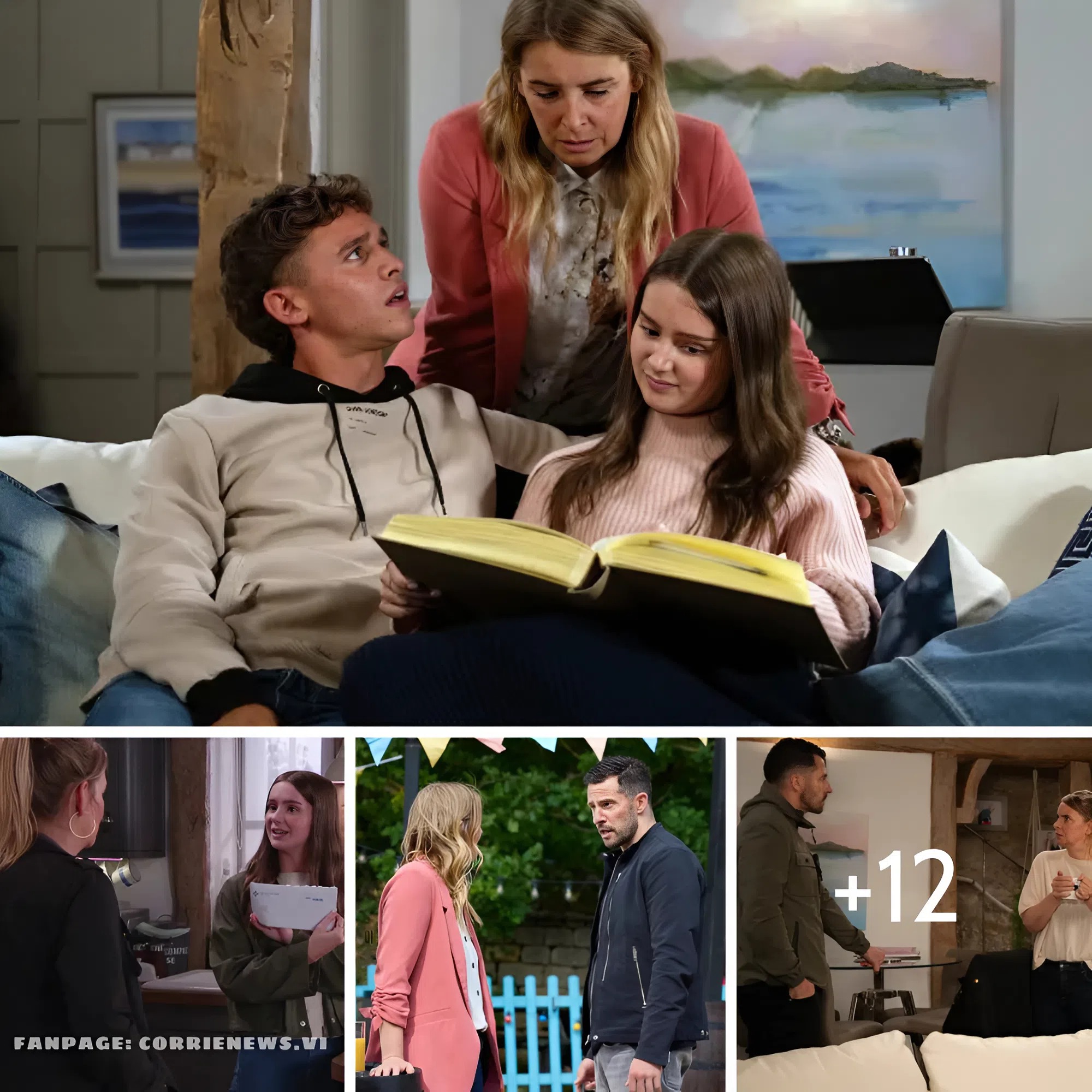 Jacob and Charity look at each other while Sarah looks through a book in Emmerdale