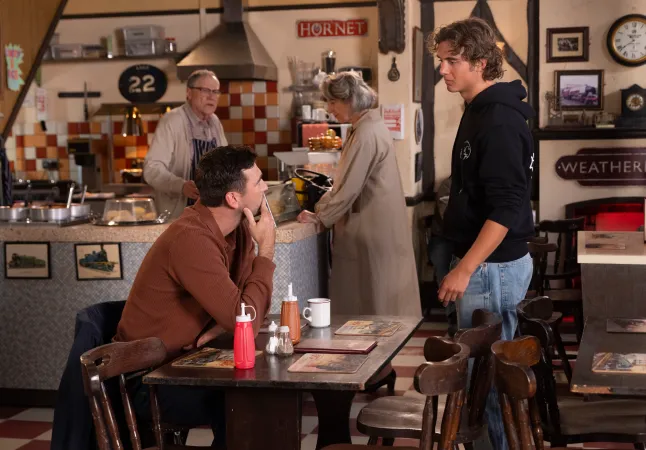 Carl Webster (Jonathan Howard) is under serious pressure next week in Coronation Street, as DC Kit Green (Jacob Roberts) is determined that he had something to do with Tyrone Dobbs’ (Alan Halsall) hit and run and intends to prove it.